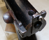 THIS EARLY SENIOR IS ION A CONDITION IN WHICH IT COULD BE WELL WORTHY OF RESTORATION AND COMPLETE REFINISHING. IT IS COMPLETE WITH ALL ORIGINAL COMPONENTS ASIDE FROM A TINY WIRE SPRING WHICH MAKES THE STIRRUP LATCH GO BACK PROPERLY. HOWEVER IT DOES STILL FUNCTION PERFECTLY. WELL NOT PERFECTLY BUT ADEQUATELY. THE RIGHT HAND GRIP HAS A SMALL HOLE IN ONE CORNER AND A SMALL CHIP OUT OF IT, THE LEFT HAND GRIP HAS SOME MATERIAL MISSING AT THE BASE OF THE GRIP. THE MARKINGS ARE JUST ABOUT VISIBLE AND THE SERIAL NUMBER IS LEGIBLE. AS WE SAID WE DO NOT NORMALLY RECOMMEND REFINISHING ANTIQUE PISTOLS BUT THIS OCCASION WE THINK IS A DEFINITE CANDIDATE FOR THAT COURSE OF ACTION.