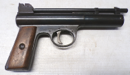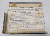 PLACED IN ONE OF OUR SUPERB REPRODUCTION BOXES WITH SOME PERIOD MARKSMAN PELLETS AND ALSO A REPRINT OF AN ORIGINAL LEAFLET AND SAFETY INSTRUCTIONS. A NICE PISTOL BUT A SHAME ABOUT THE CRACKED GRIP.