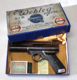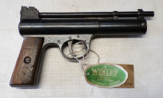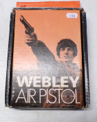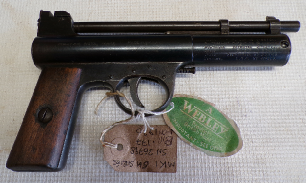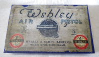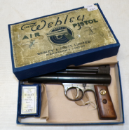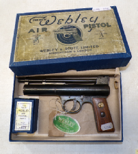 THIS EARLY WEBLEY PISTOL PRESENTS VERY NICELY HAVING A STRONG AMOUNT OF FINISH ON IT, ALL THE MARKINGS ARE CLEAR THERE IS THE ODD BIT OF PITTING AND SURFACE MARKS, ITS POSSIBLY BEEN BLUED OVER THESE ITS DIFFICULT TO TELL BUT IT DOES LOOK VERY NICE. ALL COMPONENTS ARE ORIGINAL AND WORKING AS THEY SHOULD BE. SOME MARKS AND SCRATCHES TO THE PISTOL GRIP, WE HAVE PLACED IT IN ONE OF OUR REPRODUCTION BOXES WITH A SEPARATE BOX FOR PELLETS AND PUT ONE OF OUR REPRODUCTION LABELS ON IT SO ITS A NICE COLLECTOR’S ITEM THAT LOOKS GOOD.