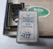 THIS NOW SCARCE EARLY FIRST SERIES SENIOR IS IN VERY GOOD CONDITION, IT MAY HAVE BEEN REFINISHED OR IT MAY HAVE BE ITS ORIGINAL FINISH IT IS A VERY NICE BLUE/BLACK COLOUR. PISTOL ITSELF IS IN EXCELLENT CONDITION WITH ALL MARKINGS CLEARLY VISIBLE, ALL COMPLETE ONE SMALL CHIP TO THE LEFT HAND GRIP BUT ALL OTHER COMPONENTS SEEM TO BE PERFECT. WE HAVE HOUSED IT IN ONE OF OUR SUPERB REPRODUCTION BOXES WITH A SEPARATE PELLET BOX AND A REPRODUCTION TAG AS WELL. A NICE COLLECTOR’;S ITEM.
