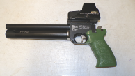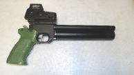 THIS SINGLE SHOT PCP PISTOL IS ION EXCELLENT AS NEW CONDITION IT HAS JUST BEEN FITTED WITH A NEW GAUGE ASSEMBLY AT THE FRONT AND HOLDS AIR PERFECTLY. IT IS FITTED WITH A MILBRO CLEAR VIEW RED DOT HOLOGRAPHIC TYPE SIGHT WHICH GIVES ONE A CHOICE OF RED OR GREEN CIRCULAR RETICLE IMAGE. SHOOTS AT GOOD VELOCITY AND THESE PISTOLS HAVE PROVEN TO BE HIGHLY ACCURATE. COMPLETE WITH FILLING ADAPTER AND SPARE O RINGS SHOULD THEY BE REQUIRED.