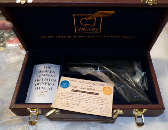 THIS IS THE VERY FIST VERSION OF THE TURKISH MADE WEBLEY ARE PISTOLS PRODUCED IN 2010 IN LIMITED EDITION OF 2000 TO COMMEMORATE THE CENTENARY OF WEBLEY’S FIRST AIR PISTOL PATENT OF 1910. THIS EXAMPLE IS UNUSED, STILL SEALED IN ITS PLASTIC PACKAGING IN ITS VERY NICE QUALITY CASE WITH CERTIFICATE. ITS ALSO A VERY LOW SERIAL NUMBER AND MAKES A LOVELY COLLECTABLE ITEM. COMPLETE WITH ITS CERTIFICATE OF AUTHENTICITY, OWNER’S MANUAL AND WARRANTY REGISTRATION CARD AND A CLEANING BRUSH THAT WAS SUPPLIED WITH IT. A BIT OF HISTORY.
