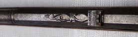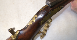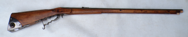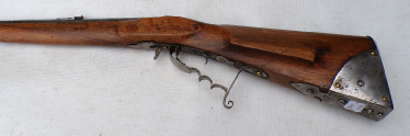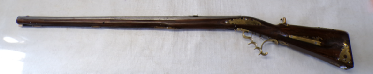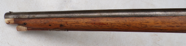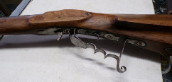 THIS IS A REALLY ANCIENT AIR GUN. IT IS COCKED USING A DETACHABLE LEVER OPERATING ON A SQUARE LUG AT THE BOTTOM OF THE STOCK. WE BELIEVE THERE WILL BE A SPRING PISTON MECHANISM INSIDE THE HOLLOW STOCK. THERE ARE NO MAKER’S MARKS THIS WOULD HAVE BEEN USED FOR SHORT RANGE TARGET SHOOTING INDOORS USING LARGE DARTS, IT WOULD HAVE BEEN VERY ACCURATE BUT NOT THAT POWERFUL. THERE WOULD HAVE BEEN AN ADJUSTABLE PEEP SIGHT FITTED THIS IS MISSING. IT DOES HAVE A MIDDLE REAR SIGHT WHICH SEEMS FIXED RATHER THAN ADJUSTABLE AND A MINUSCULE FRONT SIGHT. THE METALWORK IS A CLEANED OFF SILVERISH GREY WITH PITTING AND PATINA OVERALL. THE FULL LENGTH STOCK IS FAIRLY GOOD HAS A REPAIR ON THE RIGHT HAND SIDE OF THE HOLLOW SHELL OF THE BUTT. BONE FORE END TIP AND CLEANING AND RAM ROD WHICH SEEMS ORIGINAL TO THE GUN. A LITTLE LEVER IS PUSHED AND THE BARREL OPENS UP TO SHOW THE LARGE OCTAGONAL BARREL WITH A BORE OF ABOUT 7mm CALIBRE. WE HAVE NOT TESTED THE MECHANISM AND WE DON'T KNOW IF THE MECHANISM IS INSIDE AS WE HAVE NOT OPENED THE GUN.. IT APPEARS TO HAVE HAD A SET TRIGGER MECHANISM BIT THE VERY THIN WIRE ‘HAIR’ TRIGGER HAS BROKEN OFF LEAVING JUST THE MAIN TRIGGER IN PLACE. OBVIOUSLY THIS IS A DECORATIVE ITEM BEING ABOUT 270 YEARS OLD. ISH.