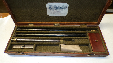 This antique air rifle/air shotgun is in lovely condition. The action has some really nice engraving on it on both sides and top, scroll work on the hammer and with the makers name J Bull, Bedford in a banner within scroll work on the left hand side. There is no pitting the metal is smooth and a light brown antique type finish. The barrel is a brown Damascus twist effect in good order and with some light engraving to it. The butt is covered in what we believe to be the original shark skin known as shagreen which is the skin of a shark or a ray. Complete with a period pump with handle, bullet mould for 6 bullets and a foot plate. Also in a compartment is a tub of lead shot, a shot measurer, another tool marked “Baylis and Son Patent” and some wads for the shot. The case has been more recently made to fit this assembly and is a nice quality wood possibly oak with brass corners and escutcheons there is a lock but we do not have the key so have not been able to test the lock. Overall a really nice quality English made air gun. Interestingly and somewhat unusually this has a rifled c.30 cal barrel that fits in with a bayonet fit to the outer .50 inch smoothbore barrel. There is a pin across the rifled barrel so you can not push the ball in too far using the loading rod. There is a safety bypass on this so you can de cock it without firing should a hunting opportunity be missed you do not have to fire it off. A truly lovely item. There is a trade label in the top of the case for J Beattie of 205 Regent Street London. A similar rifle/shotgun matching almost exactly this pattern has been with a similar trade label in the lid so we made a copy of that and put it with this one. We have never seen a trade label for John Bull of Bedford as they were only in business a short period of time being 1846 to 1854 at High Street Bedford. James Beattie was at 205 Regent Street from 1848-