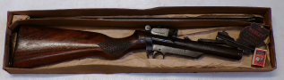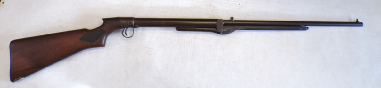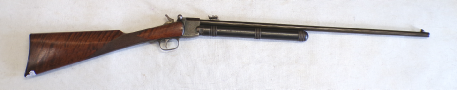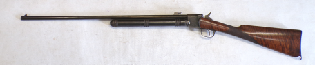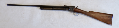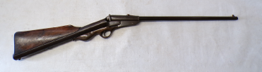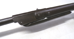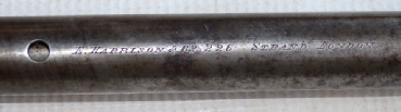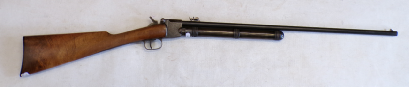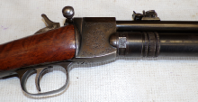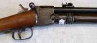 This is something you do not see every day. In fact this is only the 2nd one we have ever seen in the flesh as it were. This is basically a cheapened and lightened version of Quackenbush’s original model 1 using the same principal of the barrel sliding in to cock then sliding out after loading but made of a tubing rather than casting. This example is a little bit tired with some pitting on the barrel and a slither of wood thin slither missing on the fore end, metalwork is grey and slightly grainy overall. The spring seems quite week but is present and probably original. Has had a hole drilled through the butt presumably for the fitting of a sling of some sort and has an s ring through the drop down tab on the underside of the barrel. Markings are visible on top of the cylinder being H M Quackenbush Herkimer NY and then the patent numbers. Generally complete apart from aforementioned slither of wood. An interesting little antique.