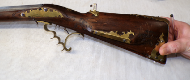 THIS IS A REALLY NICE OLD ANTIQUE AIRGUN. IT HAS A SPIGOT IN THE STOCK WHICH WOULD HAVE ACCEPTED A CRANK TO COMPRESS BELLOWS OR COMPRESS A SPRING WE BELIEVE THIS WOULD HAVE BEEN A SPRING PISTON UNIT WE HAVE NOT OPENED THE GUN TO SEE WHAT IT IS. THIS IS A REALLY NICE QUALITY ITEM WITH LOTS OF BRASS WORK AND NICE FEATURES ABOUT IT. IT IS A GALLERY GUN FOR SHOOTING INDOORS AT TARGETS, WOULD OF HAD A DIOPTER PEEP SIGHT ON THE BACK BUT THIS IS MISSING BUT THE POST WHERE IT WOULD HAVE GONE AND THE SCREW THAT WOULD HAVE RETAINED IT ARE STILL THERE. HAS A DOUBLE SET TRIGGER WHEREBY YOU PULL THE REAR TRIGGER TO SET THE FRONT HAIR LIKE TRIGGER TO GIVE A VERY NICE LIGHT TRIGGER PULL. THIS MECHANISM IS WORKING. ENGRAVED ON TOP OF THE BARREL IOS KREUG IN LINZ. WE BELIEVE THIS WOULD HAVE BEEN JOS FOR JOSEPH OR SIMILAR KREUG IN LINZ WHICH IS IN AUSTRIA. HAS ALSO A MIDDLE REARSIGHT WITH A TINY LITTLE NOTCH IN IT AND A BONE FRONT SIGHT IN A DOVE TAIL. WITH AS DECORATIVE RAM ROD, THE BARREL OPENS FOR LOADING A DART OF QUITE LARGE CALIBRE, THE BARREL BORE ITSELF IS A BIT DIRTY IT HAS NOT HAD ANYTHING THROUGH THE BARREL FOR MANY YEARS BY THE LOOKS OF IT. A NICE DECORATIVE ANTIQUE THERE ARE NOT MANY 250 YEAR OLD GUNS YOU CAN BUY FOR THIS SORT OF PRICE. THE CONDITION IS REAsonably good there is some obvious old repairs TO THE WOOD WHICH IS RATHER THIN IN THE BUTT AREA AS IT CONTAINS A MECHANISM. ALSO THERE IS A SMALL PIECE OF DECORATIVE BRASS MISSING IN FRONT OF THE TRIGGER GUARD AND A COUPLE OF CRACKS AND REPAIRS TO THE FORE END WHICH HAVE BEEN DONE IN PART OF ITS ANCIENT HISTORY.