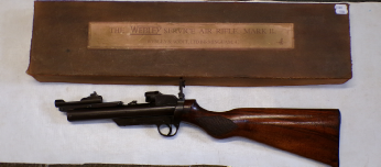 THIS IS A VERY NICE EXAMPLE OF THIS EARLY ENGLISH MADE AIR RIFLE THIS EXAMPLE HAS BEEN REFINISHED TO A VERY HIGH STANDARD THE METALWORK BEING AN ALL EVEN BLACK FINISH, HOWEVER ALL THE MARKINGS ARE ALL STILL FULLY VISIBLE THEY HAVE NOT BEEN POLISHED OUT AND IN FACT THE BRITANNIA TRADE MARK ON THE LEFT HAND SIDE OF THE FRAme is extrremely clear SERIAL NUMBER ON ALL MAIN COMPONENTS. THE STOCK HAS NOT BEEN REFINISHED IT HAS A LOVELY ORIGINAL PATINA WITH SOME SURFACE MARKS AND LIGHT SCRATCHES BUT NO WOOD MISSING. THERE IS EXTREMELY FINE HAIRLINE CRACKS DOWN BOTH SIDES OF THE PISTOL GRIP WHERE IT MEETS THE METALWORK WHERE THE METAL HAS DRIED OUT BUT THESE ARE AS WE SAID ONLY JUST VISIBLE. ORIGINAL METAL BUTT PLATE FITTED, ALL THE COM POINTS SEEM TO BE THE ORIGINAL INCLUDING THE SIGHTS, .25 CALIBRE WE HAVE ALSO INCLUDED ONE OF OUR REPRODUCTION BRITANNIA TOOLS WHICH IS A VERY CLOSE COPY OF THE ORIGINAL THAT IS IN OUR COLLECTION. A VERY NICE INTERESTING RIFLE SUPPOSEDLY AN IMPROVED BRITANNIA ALTHOUGH IN FACT WE THINK THE ORIGINAL BRITANNIA WAS A BETTER DESIGN BUT THIS IS HIGHLY UNUSUAL AND INTERESTING. A NICE COLLECTOR’S ITEM.