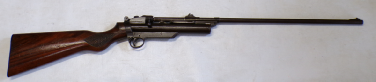 THIS IS THE MUCH RARER SHOTGUN VERSION OF THE GIFFARD CO2 RIFLE, IT HAS A SMOOTH BORE BARREL AND USED LEAD SHOT EMBEDDED IN A CHALK CARTRIDGE AND WHEN SHOT THE CHALK DISINTEGRATED LEAVING THE SHOT TO GO TO ITS TARGET. THIS EXAMPLE PRESENTS NICELY THE METALWORK WE BELIEVE HAS BEEN REFINISHED BUT HAS BEEN DONE REALLY NICELY WITH A NICE EVEN BLACK, ALL THE MARKINGS ARE STILL VISIBLE AND QUITE CRISP INCLUDING THE SCROLL ENGRAVING ON ALL SIDES OF THE BREECH BLOCK, SERIAL NUMBER AND CALIBRE ON THE BARREL, ALL SERIAL NUMBERS AND MARKINGS ON THE CYLINDER WHICH IS ALSO IN NICE CONDITION. THE REARSIGHT IS A FOLDING DOWN LEAF WHICH IS ORIGINAL HOWEVER THE FRONT SIGHT WHICH WOULD HAVE BEEN A SMALL BEAD HAS BEEN REPLACED BY A BRASS THREADED PIECE. AGAIN THE TRIGGER GUARD HAS NICE ENGRAVING ON IT AND IF IT HAS BEEN REFINISHED IT HASNT BEEN OVERLY POLISHED. THE STOCK HOWEVER IS A DIFFERENT STORY. IT HAS SUFFERED FROM A SEVERE BOUGHT OF WOODWORM AND HAS BEEN REFINISHED AND THE CHECKERING RUBBED DOWN. WHICH IS A SHAME. IT HAS OBVIOUSLY BEEN STORED SOMEWHERE WHERE WOODWORM HAVE GOT AT IT BUT THANKFULLY THEY DONT TOUCH METAL! A NICE QUALITY VERSION OF THE GIFFARD RIFLE WHICH DIFFERS AT THE BREECH AND SIGHTS ETC TO THE STANDARD RIFLE.