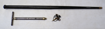 PATTERN. WOULD HAVE BEEN SOME GENTLEMAN’S FAVOURED ITEM BACK IN THE DAY. A NICE ANTIQUE. WE SUSPECT THE CAIN HAS BEEN RE JAPANNED OR LACQUERED OR PAINTED AS IT HAS A LOT OF BLACK ENAMEL TYPE FINISH TO IT. IN AN OLD CASE WHICH HAS BEEN PUT TOGETHER FOR THIS KIT PRESUMABLY.