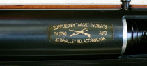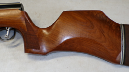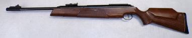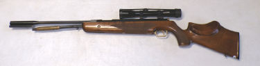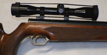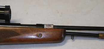 Shooting at around 500 foot per second using Air Arms pellets for 8.8 ft/lbs this is a shooter’s example rather than a collector’s example as there is no paint finish on the trigger block or trigger guard. The rear sight has been removed in favour of a 4 x 40 Mil dot scope on adapted Sportsmatch style mounts. Rest of the metalwork is smooth even gray to brown type finish, stock is Ok with one hairline crack thats been repaired near the trigger block and the rest of the stock presumably refinished. A good solid rifle and fitted with a scope makes a shootable item.