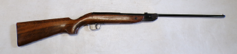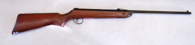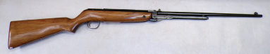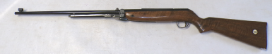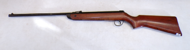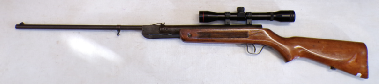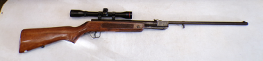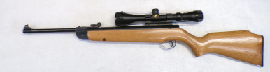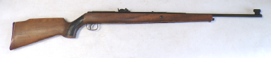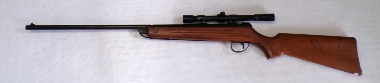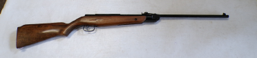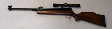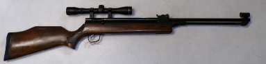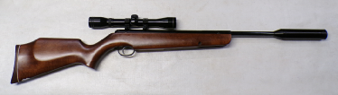 A very popular junior rifle with sales in the millions, this example is a mark 6 version with a manual safety catch in the trigger guard. In excellent condition retaining vertually all its original blued finish and unmarked stock. No open sights present, has been fitted with a Gamo 4x28 scope which is ok only. Cocks and shoots fine at about 8 foot pound but quite easy to cock. It has recently been fully serviced with some new parts. Has an anti bear trap mechanism safety which means it can not be de cocked which could be considered a good thing on a junior/beginner’s air rifle.