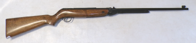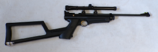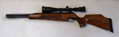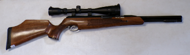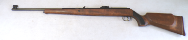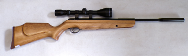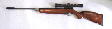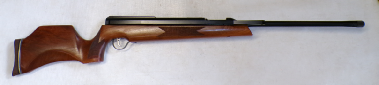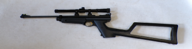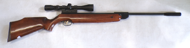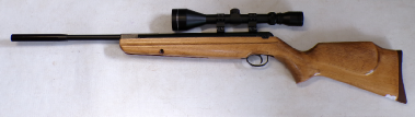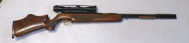 YEARS AGO WE BOUGHT A SMALL QUANTITY OF THESE AT A VERY GOOD PRICE BUT THEY ALL DID ABOUT 7 FOOT POUNDS. WE WORKED VERY HARD TO GET THE POWER UP BUT COULD NOT GET ANY OF THEM MUCH ABOVE 8 FOOT POUNDS NO MATTER WHAT WE DID. WE RECALL CUTTING SOME GROOVES IN THE PISTON SEAL A BIT LIKE A ZEPHYR PISTON SEAL AND THAT MOD ACHIEVED THE HIGHEST POWER WE GOT OUT OF ANY OF THEM WHICH WAS 8.5 FOOT POUNDS. WE FELT THEY SHOULD DO MORE THEY ARE A REASONABLY WELL MADE GUN, QUITE SOLID. THIS ONE HOWEVER PRODUCES OVER 9 FOOT POUNDS. IT COCKS FAIRLY SMOOTHLY, NOT UNPLEASANT TO SHOOT, IS IN VEREY GOOD CONDITION RETAINING MOST OF ITS ORIGINAL FINISH, AND FEW MINOR SURFACE MARKS AND SCUFFS TO THE STOCK, HAS A FRONT SIGHT FITTED BUT NO REAR SIGHT BUT IS FITTED WITH A 4X40 RICHTER OPTIK SCOPE. A NICE LITTLE LOW COST HUNTING COMBO.