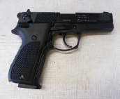 6 shot revolver, removable shells to load pellets, metal body, 6” barrel. Boxed with instructions. BLACK FINISH, SINGLE/DOUBLE ACTION TRIGGER, WITH SMALL ARMS TRAINING PAMPHLET (MAYBE FOR PEOPLE WITH SHORT UPPER LIMBS)