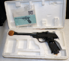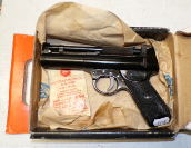 PLACED IN ONE OF OUR SUPERB REPRODUCTION BOXES WITH SOME PERIOD MARKSMAN PELLETS AND ALSO A REPRINT OF AN ORIGINAL LEAFLET AND SAFETY INSTRUCTIONS. A NICE PISTOL BUT A SHAME ABOUT THE CRACKED GRIP.