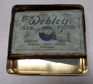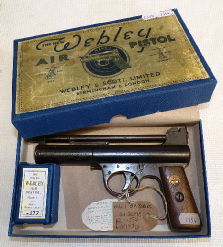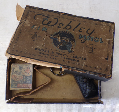 THIS EARLY WEBLEY PISTOL PRESENTS VERY NICELY HAVING A STRONG AMOUNT OF FINISH ON IT, ALL THE MARKINGS ARE CLEAR THERE IS THE ODD BIT OF PITTING AND SURFACE MARKS, ITS POSSIBLY BEEN BLUED OVER THESE ITS DIFFICULT TO TELL BUT IT DOES LOOK VERY NICE. ALL COMPONENTS ARE ORIGINAL AND WORKING AS THEY SHOULD BE. SOME MARKS AND SCRATCHES TO THE PISTOL GRIP, WE HAVE PLACED IT IN ONE OF OUR REPRODUCTION BOXES WITH A SEPARATE BOX FOR PELLETS AND PUT ONE OF OUR REPRODUCTION LABELS ON IT SO ITS A NICE COLLECTOR’S ITEM THAT LOOKS GOOD.