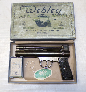 THIS NOW SCARCE EARLY FIRST SERIES SENIOR IS IN VERY GOOD CONDITION, IT MAY HAVE BEEN REFINISHED OR IT MAY HAVE BE ITS ORIGINAL FINISH IT IS A VERY NICE BLUE/BLACK COLOUR. PISTOL ITSELF IS IN EXCELLENT CONDITION WITH ALL MARKINGS CLEARLY VISIBLE, ALL COMPLETE ONE SMALL CHIP TO THE LEFT HAND GRIP BUT ALL OTHER COMPONENTS SEEM TO BE PERFECT. WE HAVE HOUSED IT IN ONE OF OUR SUPERB REPRODUCTION BOXES WITH A SEPARATE PELLET BOX AND A REPRODUCTION TAG AS WELL. A NICE COLLECTOR’;S ITEM.