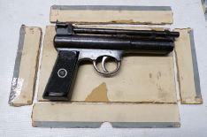 THIS 68 YEAR OLD PISTOL IS IN VERY GOOD CONDITION RETAINING LOTS OF ITS ORIGINAL FINISH, ALL COMPLETE WITH ALL MARKINGS VISIBLE AND THE GRIPS ARE ALSO GOOD. CONTAINED IN ITS ORIGINAL BOX THE BOX IS NOT IN GREAT CONDITION ITS ACTUALLY BEEN SHOT AT AND HAS SOME OF THE SIDES OF THE BASE AND TOP MISSING. BUT ITS DONE ITS JOB OF PRESERVING THE ;PISTOL IN GOOD CONDITION. WITH A REPRO OR REPLICA BULLDOG TYPE PELLETS BOX WHICH IS EMPTY. A NICE COLLECTOR’S ITEM ONCE SOMEONE’S TREASURED POSSESSION UNFORTUNATELY THEY DID SHOOT AT THE BOX. THERE WAS ALMOST A WAR ON SO ITS ALL THEY PROBABLY HAD TO SHOOT AT!