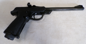 THIS NICE QUALITY PISTOL IS IN VERY GOOD CONDITION RETAINING VIRTUALLY ALL ITS ORIGINAL FINISH JUST WITH A SMALL AREA OF DISCOLOURATION TO THE ANODISING ON THE LEFT HAND SIDE OF THE CYLINDER. SOME SLIGHT SIGNS OF USE AND WEAR BUT NOTHING NOTABLE, IN ITS ORIGINAL BOX WITH A WOODEN COCKING AID, THE BOX ITSELF IS IN VERY GOOD CONDITION.