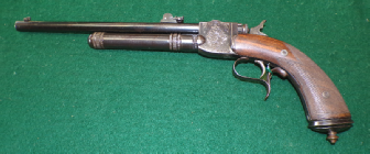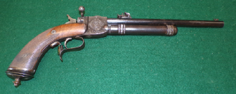 THIS IS A VERY RARE EARLY AIR PISTOL IT HAS AN OUTSIDE LOCK MECHANISM WHEREBY ALL THE WORKINGS OF THE LOCK ON THE OUTSIDE OF THE ACTION, VERY WELL MADE, IN GOOD CONDITION, THE PISTOL GRIP COME BUTT RESERVOIR HAS BEEN RECOVERED IN LEATHER THE ACTION HAS SOME LIGHT ENGRAVING AROUND THE PLATE EDGES, THERE IS NO MAKERS NAME OR OTHER MARKS ON THE GUN. THE BARREL IS A BRASS UNIT MAYBE CONTEMPORARY TO THE GUN MAYBE LATER ADDITION WE ARE NOT SURE. THE MECHANISM IS IN NICE SOLID CLEAN STATE, THIS WOULD BE A MUZZLE LOADER OF APPROX .38” CALIBRE. A RARE ANTIQUE FROM 230 ISH YEARS AGO.