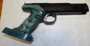 SINGLE STROKE PNEUMATIC, SHOOTS SUPERBLY, WITH GREEN LAMINATE GRIPS, SOME LIGHT SCRATCHES ON METALWORK BUT NOTHING TO WORRY ABOUT. IN CASE WITH INSTRUCTIONS