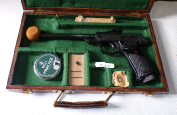 THIS SUPERB QUALITY PISTOL IS IN JUST ABOUT NEW CONDITION BUT WAS MADE NEARLY 50 YEARS AGO. IT IS HOUSED IN A CUSTOM MADE CASE WITH GREEN BAIZ LINING. IT ALSO INCLUDES AN ORIGINAL COCKING AID, SPARE FRONT SIGHT ELEMENT AND 2 SPARE REARSIGHT BLADES AND A PACKET CONTAINING BREECH SEALS AND A SPARE SPRING WHICH IS ONE OF OUR OWN FROM A POWAPOD. A LOVELY QUALITY COLLECTOR’S ITEM FAMOUS FOR ITS JAMES BOND CONNECTION AS SEAN CONNERY WAS PHOTOED HOLDING ONE OF THESE FOR EARLY JAMES BOND FILMS. COCKS AND SHOOTS PERFECTLY AS YOU WOULD EXPECT.