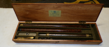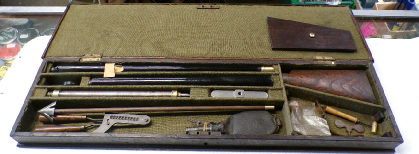 This antique air rifle/air shotgun is in lovely condition. The action has some really nice engraving on it on both sides and top, scroll work on the hammer and with the makers name J Bull, Bedford in a banner within scroll work on the left hand side. There is no pitting the metal is smooth and a light brown antique type finish. The barrel is a brown Damascus twist effect in good order and with some light engraving to it. The butt is covered in what we believe to be the original shark skin known as shagreen which is the skin of a shark or a ray. Complete with a period pump with handle, bullet mould for 6 bullets and a foot plate. Also in a compartment is a tub of lead shot, a shot measurer, another tool marked “Baylis and Son Patent” and some wads for the shot. The case has been more recently made to fit this assembly and is a nice quality wood possibly oak with brass corners and escutcheons there is a lock but we do not have the key so have not been able to test the lock. Overall a really nice quality English made air gun. Interestingly and somewhat unusually this has a rifled c.30 cal barrel that fits in with a bayonet fit to the outer .50 inch smoothbore barrel. There is a pin across the rifled barrel so you can not push the ball in too far using the loading rod. There is a safety bypass on this so you can de cock it without firing should a hunting opportunity be missed you do not have to fire it off. A truly lovely item. There is a trade label in the top of the case for J Beattie of 205 Regent Street London. A similar rifle/shotgun matching almost exactly this pattern has been with a similar trade label in the lid so we made a copy of that and put it with this one. We have never seen a trade label for John Bull of Bedford as they were only in business a short period of time being 1846 to 1854 at High Street Bedford. James Beattie was at 205 Regent Street from 1848-