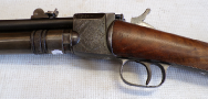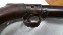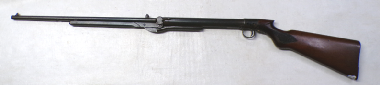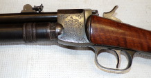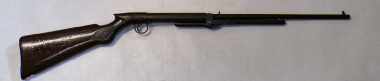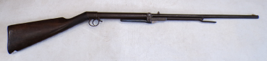This is something you do not see every day. In fact this is only the 2nd one we have ever seen in the flesh as it were. This is basically a cheapened and lightened version of Quackenbush’s original model 1 using the same principal of the barrel sliding in to cock then sliding out after loading but made of a tubing rather than casting. This example is a little bit tired with some pitting on the barrel and a slither of wood thin slither missing on the fore end, metalwork is grey and slightly grainy overall. The spring seems quite week but is present and probably original. Has had a hole drilled through the butt presumably for the fitting of a sling of some sort and has an s ring through the drop down tab on the underside of the barrel. Markings are visible on top of the cylinder being H M Quackenbush Herkimer NY and then the patent numbers. Generally complete apart from aforementioned slither of wood. An interesting little antique.