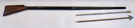 THIS IS A REALLY ANCIENT AIR GUN. IT IS COCKED USING A DETACHABLE LEVER OPERATING ON A SQUARE LUG AT THE BOTTOM OF THE STOCK. WE BELIEVE THERE WILL BE A SPRING PISTON MECHANISM INSIDE THE HOLLOW STOCK. THERE ARE NO MAKER’S MARKS THIS WOULD HAVE BEEN USED FOR SHORT RANGE TARGET SHOOTING INDOORS USING LARGE DARTS, IT WOULD HAVE BEEN VERY ACCURATE BUT NOT THAT POWERFUL. THERE WOULD HAVE BEEN AN ADJUSTABLE PEEP SIGHT FITTED THIS IS MISSING. IT DOES HAVE A MIDDLE REAR SIGHT WHICH SEEMS FIXED RATHER THAN ADJUSTABLE AND A MINUSCULE FRONT SIGHT. THE METALWORK IS A CLEANED OFF SILVERISH GREY WITH PITTING AND PATINA OVERALL. THE FULL LENGTH STOCK IS FAIRLY GOOD HAS A REPAIR ON THE RIGHT HAND SIDE OF THE HOLLOW SHELL OF THE BUTT. BONE FORE END TIP AND CLEANING AND RAM ROD WHICH SEEMS ORIGINAL TO THE GUN. A LITTLE LEVER IS PUSHED AND THE BARREL OPENS UP TO SHOW THE LARGE OCTAGONAL BARREL WITH A BORE OF ABOUT 7mm CALIBRE. WE HAVE NOT TESTED THE MECHANISM AND WE DON'T KNOW IF THE MECHANISM IS INSIDE AS WE HAVE NOT OPENED THE GUN.. IT APPEARS TO HAVE HAD A SET TRIGGER MECHANISM BIT THE VERY THIN WIRE ‘HAIR’ TRIGGER HAS BROKEN OFF LEAVING JUST THE MAIN TRIGGER IN PLACE. OBVIOUSLY THIS IS A DECORATIVE ITEM BEING ABOUT 270 YEARS OLD. ISH.