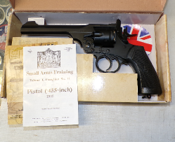 6 shot revolver, removable shells to load pellets, metal body, 6” barrel. Boxed with instructions. BLACK FINISH, SINGLE/DOUBLE ACTION TRIGGER, WITH SMALL ARMS TRAINING PAMPHLET (MAYBE FOR PEOPLE WITH SHORT UPPER LIMBS)