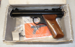 A CLASSIC CO2 POWERED PISTOL IN REALLY NICE CONDITION, ADJUSTABLE REAR SIGHT, EXCELLENT GRIPS, BOXED.