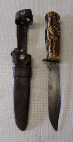 Vintage bone handle knife by W H FAGAN & SON. Sheffield made, fair condition It has a crack through bone. In a superbly made customised sheath crafted from bayonet scabbard, fitted to a leather frog. 8 and a half inches or 220mm overall length. 110mm blade. £64.00 SOLD